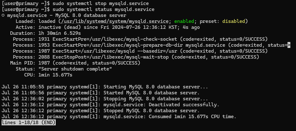 auto failover 테스트를 위해 primary의 mysqld서비스를 stop합니다.