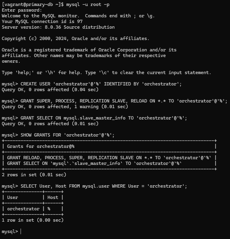 mysql> SELECT User, Host FROM mysql.user WHERE User = 'orchestrator';