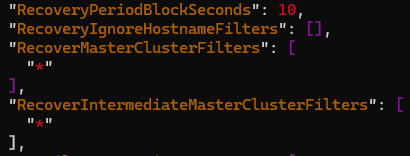 - "RecoverIntermediateMasterClusterFilters": ["*"] => 중간 마스터(Intermediate Master) 복구를 수행할 클러스터를 정의하는 필터 목록입니다. 특정 클러스터만 복구하고 싶다면, 해당 클러스터 이름을 필터로 추가합니다.