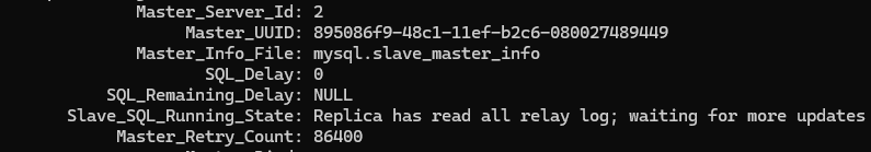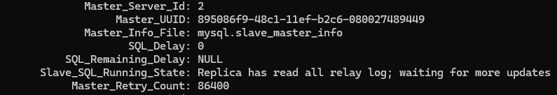 replicadb1의 server_uuid와 replicadb2의 master-uuid가 일치하므로 제대로 복제 구성이 된 것입니다.