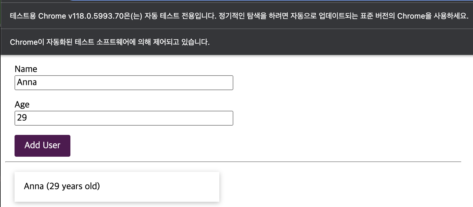 또한 Add User버튼 클릭으로 생기는 list의 결과도 테스트 해볼 수 있습니다.