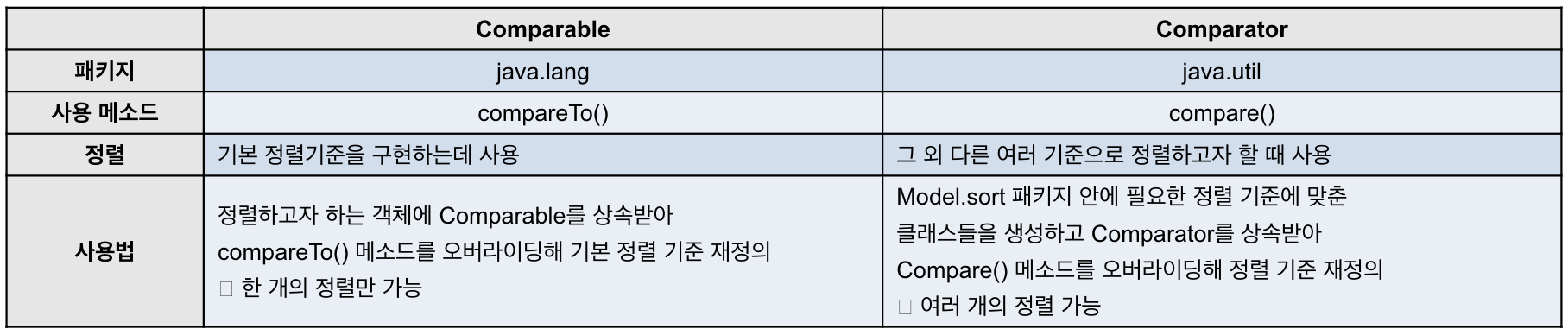 Collections.sort(List<T> list) T객체에 Comparable을 상속받아 compareTo 메소드 재정의를 통해 정렬 구현 (단 한 개의 정렬)