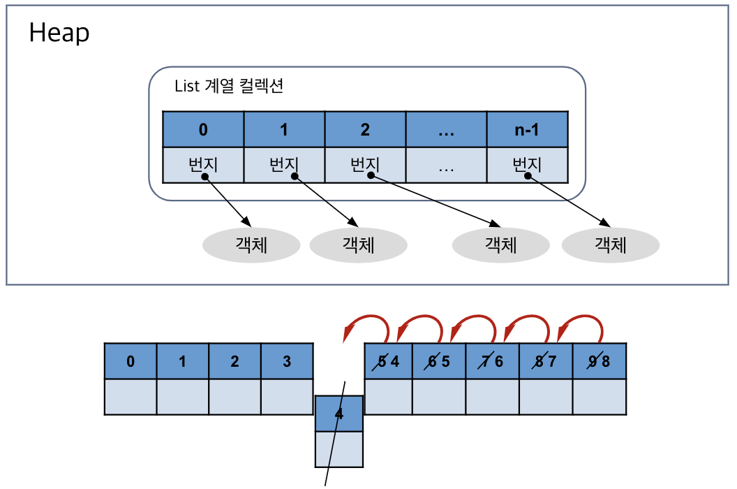 저장 용량을 초과한 객체들이 들어오면 자동으로 늘어나며 고정도 가능