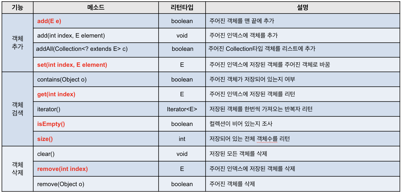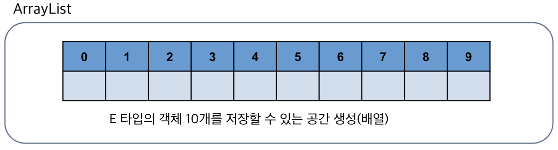 대표적인 List의 후손으로 초기 저장 용량은 10으로 자동 설정되며(List 크기가 늘었다 줄었다 하기 때문에 큰 의미가 없음 ) 따로 지정도 가능