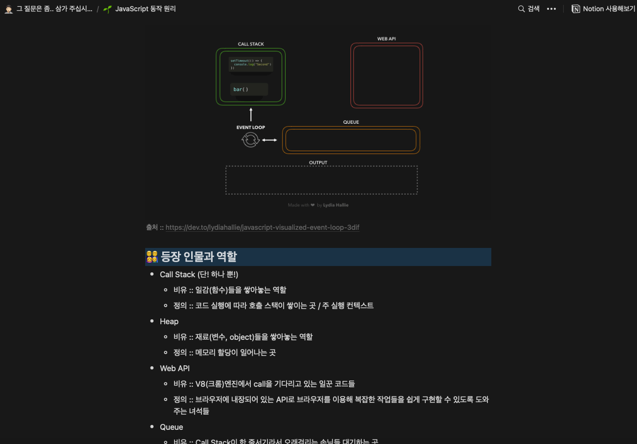 CallStack이 비어있는지 확인Queue에 할 일이 있는지 확인CallStack 비어있으면 일감을 Queue 👉🏻 CallStack으로 이동최대한 중요한 부분만 간단히 적으려 했는데 글이 꽤나 길어졌다.