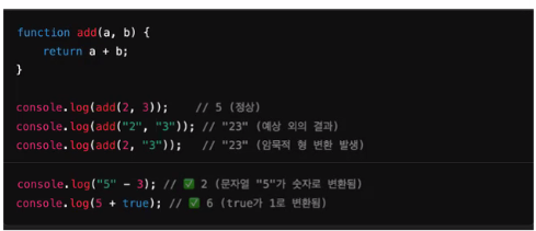 약타입은 곧 자바스크립트로, 형 변환이 알아서 일어납니다. (암시적 형변환)