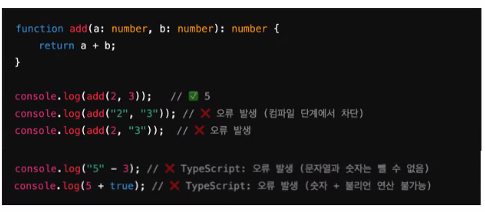 강타입은 형변환이 제약되어있습니다, 타입스크립트는 컴파일 시점에 타입 검증을 완료하는 정적 타입 언어이기 때문에 컴파일 단계에서 오류를 찾아냅니다. 즉 런타임이 넘어가기 전에 암시적 타입 변환이 일어나는 연산을 막아줍니다.