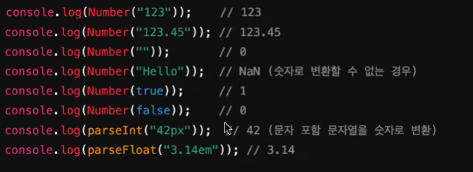 타입 형변환이라고도 합니다, undefined가 Number로는 NaN으로 바뀌고, Boolean 값으로는 False가 되는 것이 그 예시입니다.