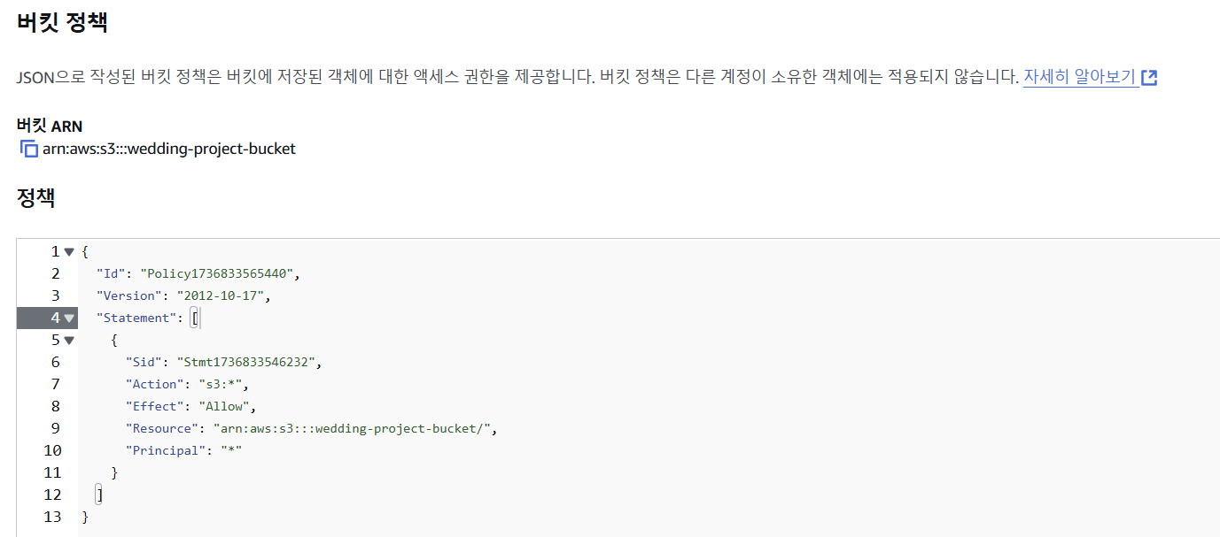 복사한 JSON 파일을 버킷 정책의 정책 부분에 붙여넣기 한 후 저장합니다.