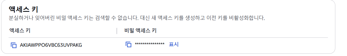 access key는 AWS / 사용자 계정 관리에서 사용자 추가 후 key를 발급하면 얻을 수 있습니다. 이때 한 번 발급하면 다시 확인할 수 없으니 키 값을 잘 저장해야 합니다.