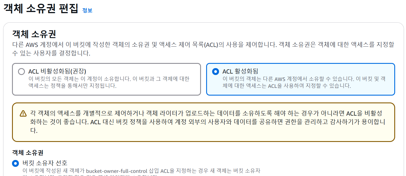 그리고 S3의 객체 소유권의 ACL을 활성화 해줘야 합니다.