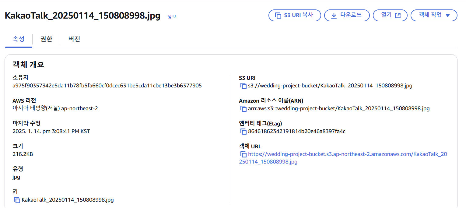우측 하단의 객체 URL을 통해 외부에서도 접근 가능한 이미지 URL을 확인할 수 있습니다.