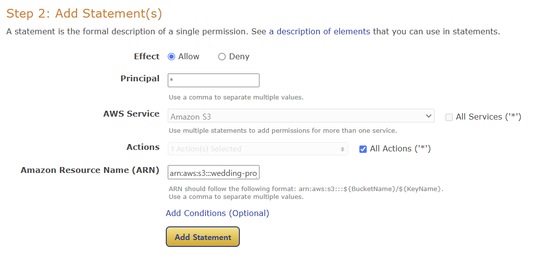 버킷 설정 -> 권한 -> 버킷 정책 편집 -> 정책 생성기