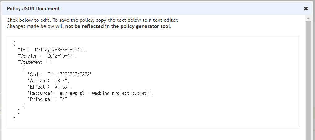 정책을 Add한 후 Generate Policy를 클릭하면 위와 같은 정책 JSON 파일이 생성됩니다. 생성된 JSON 파일을 복사합니다.