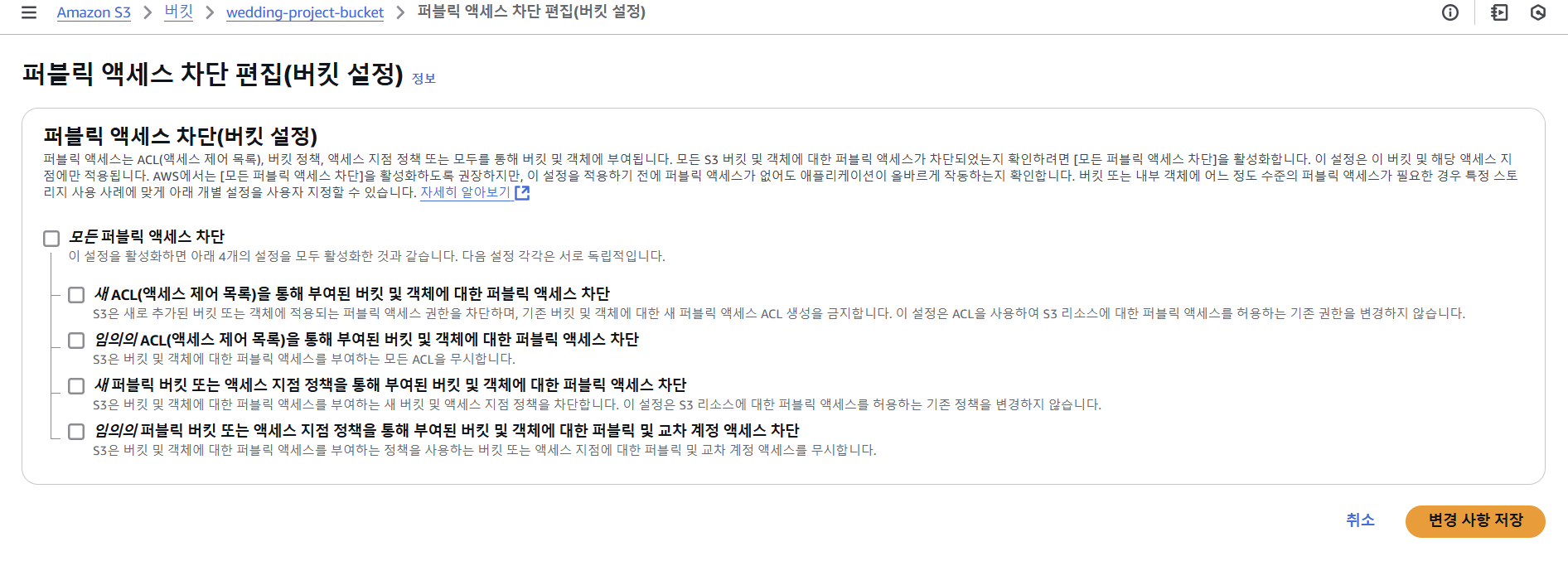 default로 설정되어 있는 액세스 차단을 모두 해제합니다. 이를 통해 S3 url을 통해 접근이 가능합니다.