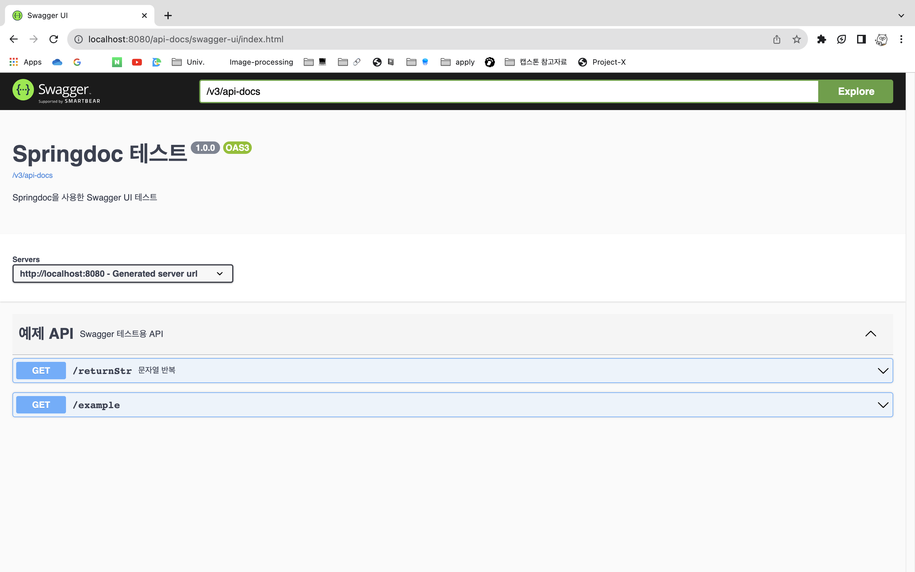 SpringBoot 프로젝트를 실행한 후 application.yml 속성에서 설정한 포트와 경로로 이동하면 API가 등록되어 있는 Swagger UI 문서를 확인할 수 있다.