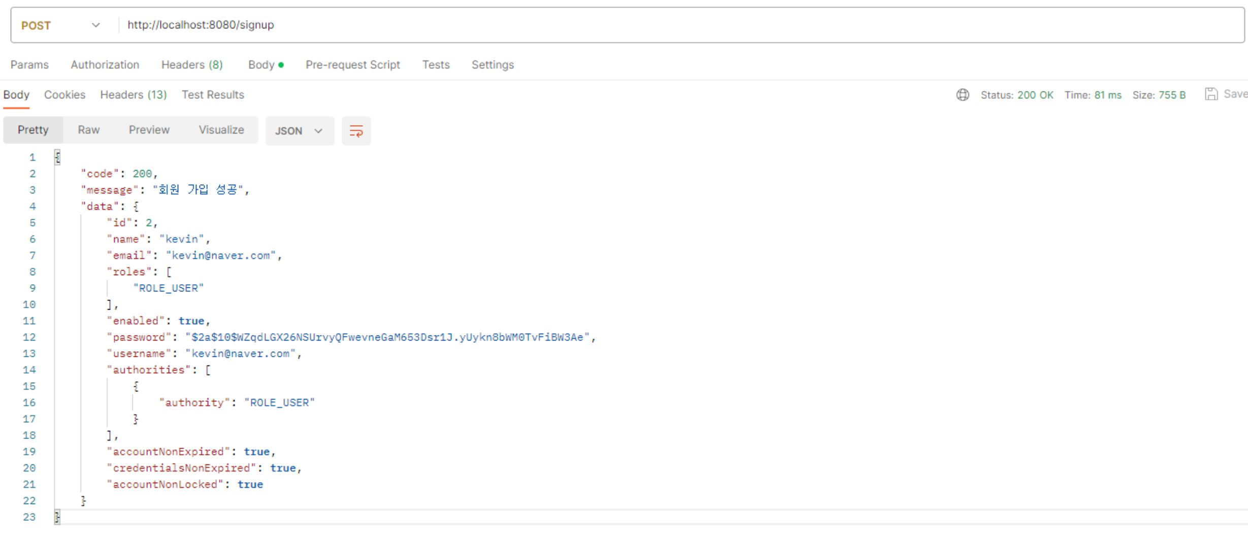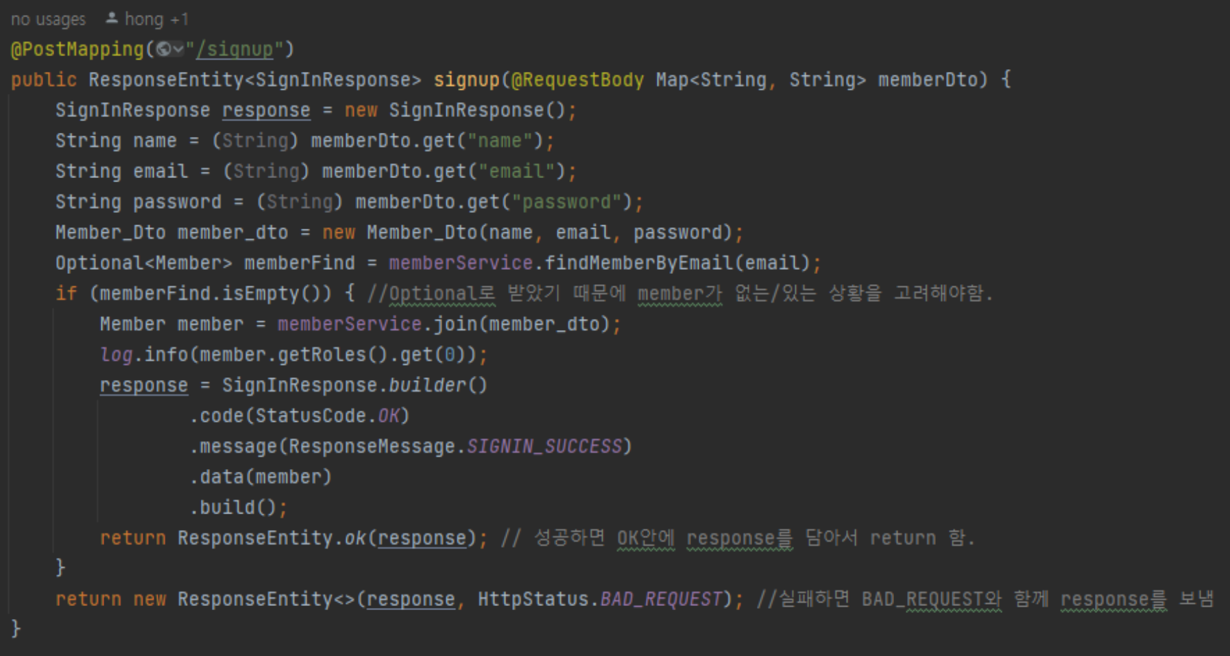 간단히 요약하면 회원가입 페이지에서 서버로 요청이 들어온 상태이고 가입하려는 사람의 name, email, password를 입력받아 중복되는 회원이 없는지 알아보고 회원가입 서비스를 실행하는 코드입니다.