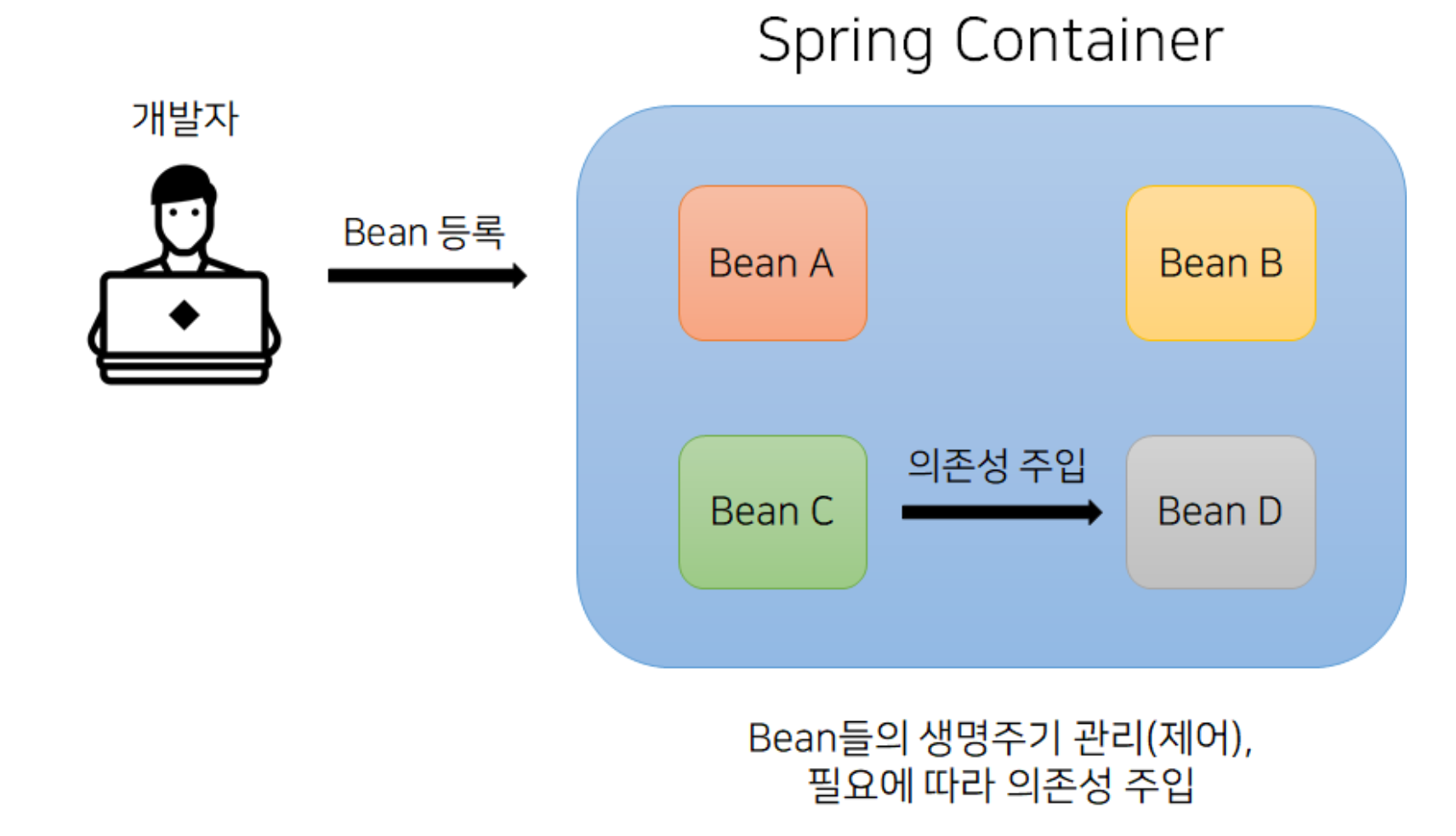 스프링 컨테이너가 필요에 따라 개발자 대신 Bean들을 관리 해주는 행위이다.