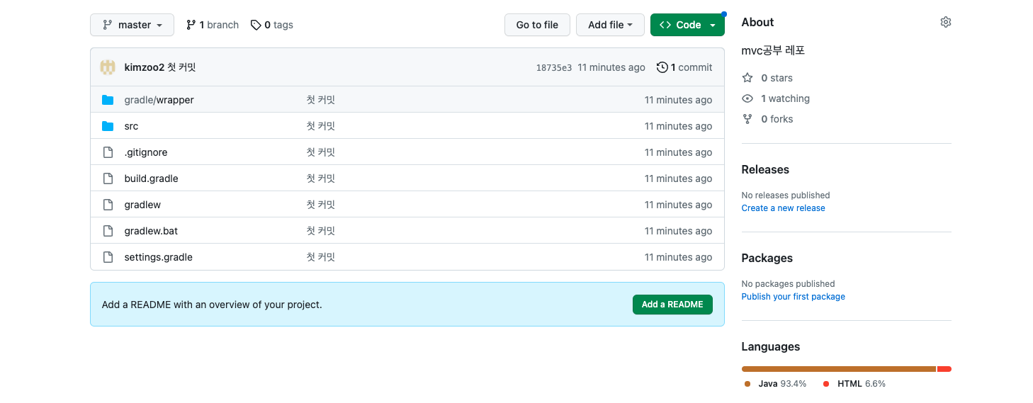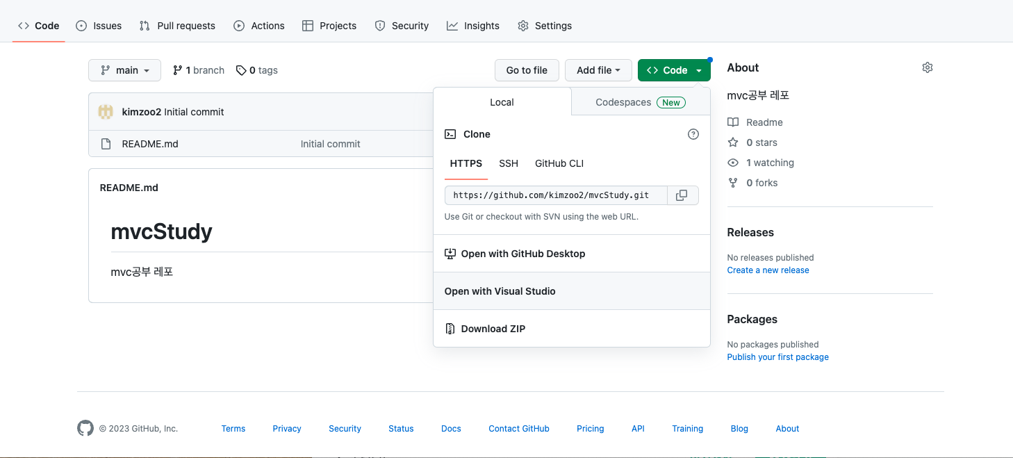 본인 git주소는 repository의 <>code 버튼을 클릭하면 알 수 있다