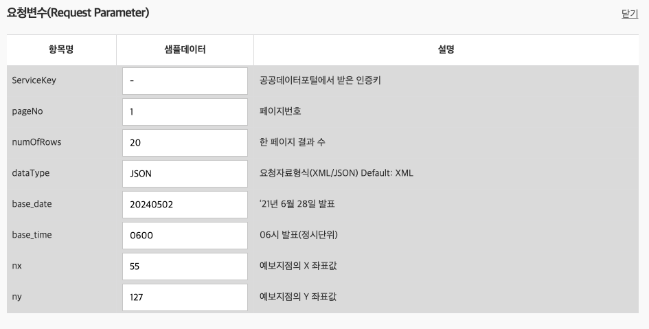 nx | 예보지점 X 좌표 | 2 | 1 | 55 | 입력한 예보지점 X 좌표 |