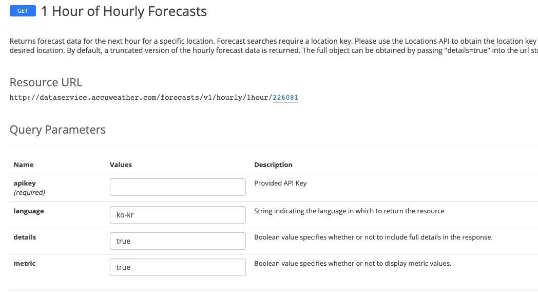 요청 url : http://dataservice.accuweather.com/forecasts/v1/hourly/1hour/{locationKey}