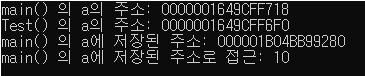 *a 는 Test()의 a에 담긴 주소로 접근(예시에서는 main()의 a로 접근)하여 해당 주소안에 저장된 값을 확인하는 것이다.