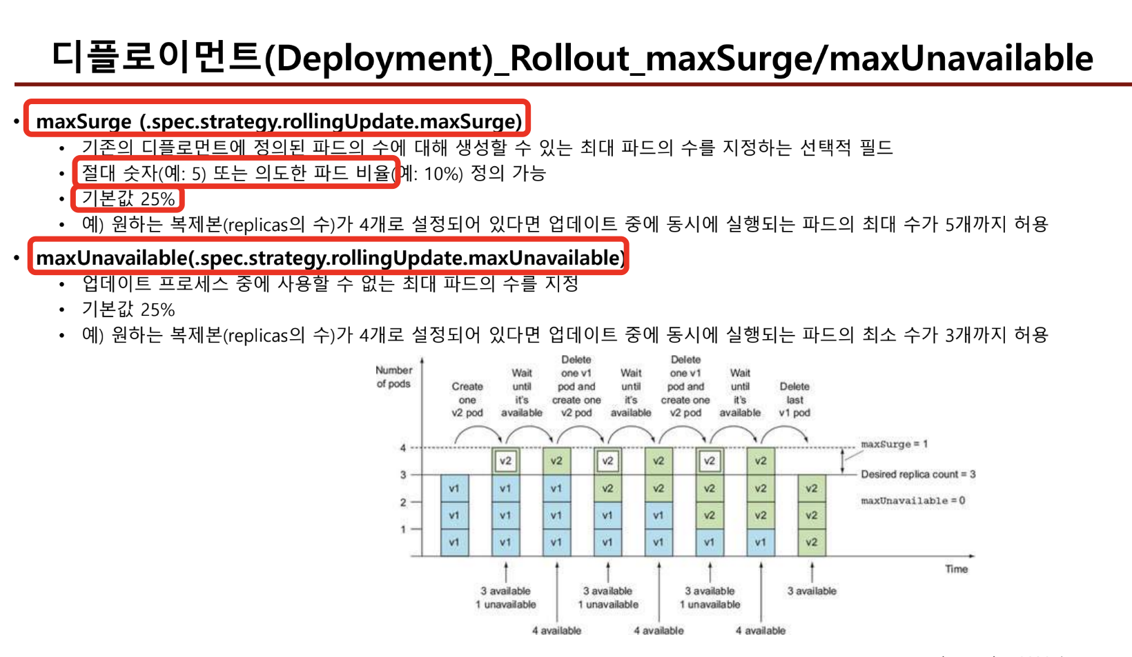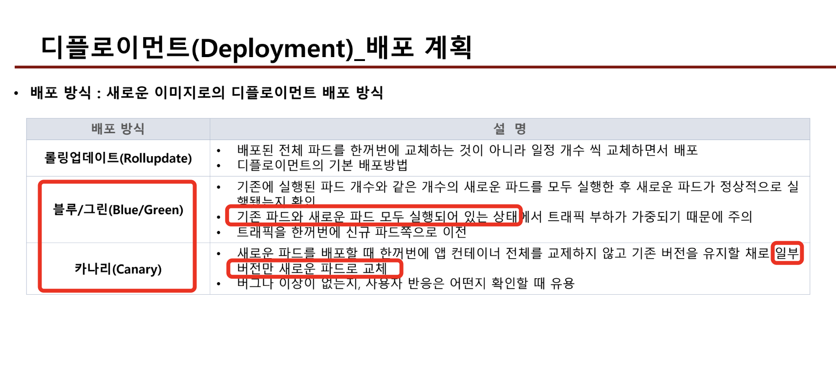 - rollingupdate는 배포중, 일시적으로 버전이 섞여서 서비스되는 타임이 존재하므로, 두 버전을 동시에 적용해도 문제가 없는 경우에만 선택하는 것이 좋다.