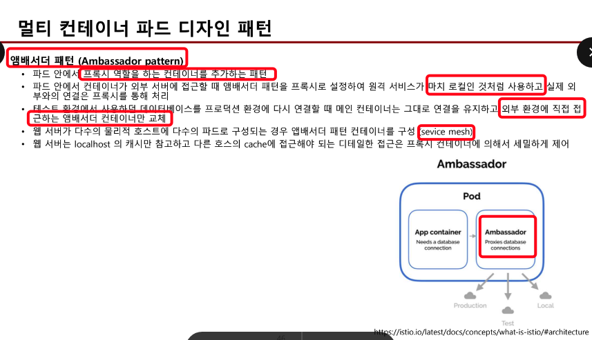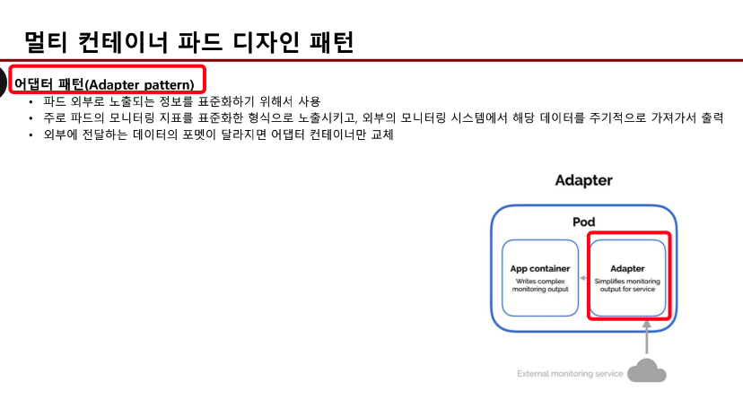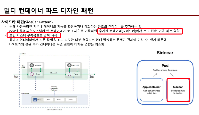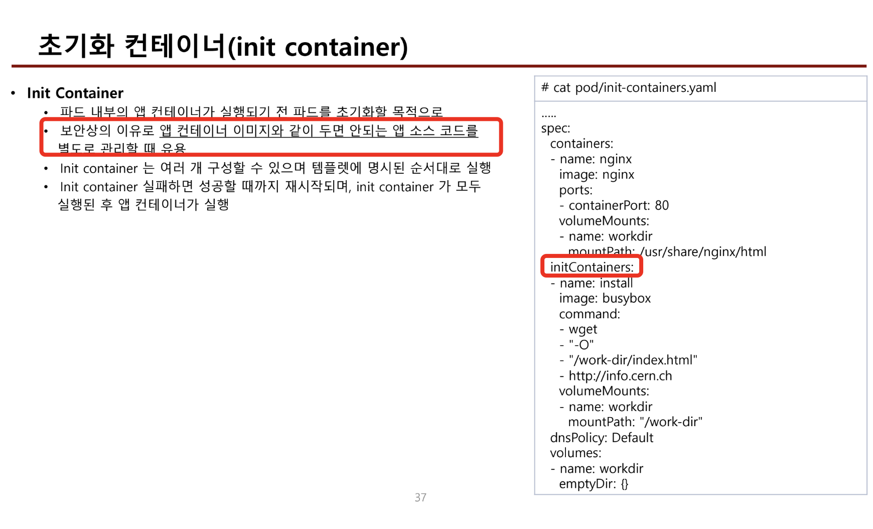 - init container는 멀티 컨테이너가 아니다. 멀티컨테이너는 동시에 여러 컨테이너가 떠 있어야 하는데, init은 순서상 본 컨테이너 이전에 떠서 초기화나, 보안목적으로 먼저 설치해야 하는 코드를 관리할 때 사용한다.
