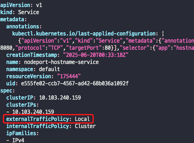 - default는 랜덤 노드로 들어와서 svc를 통해 다른 노드에 존재하는 파드로 요청이 갈수도 있지만, Local으로 지정하면 들어온 노드 내의 pod로 요청을 고정적으로 보내게 된다.