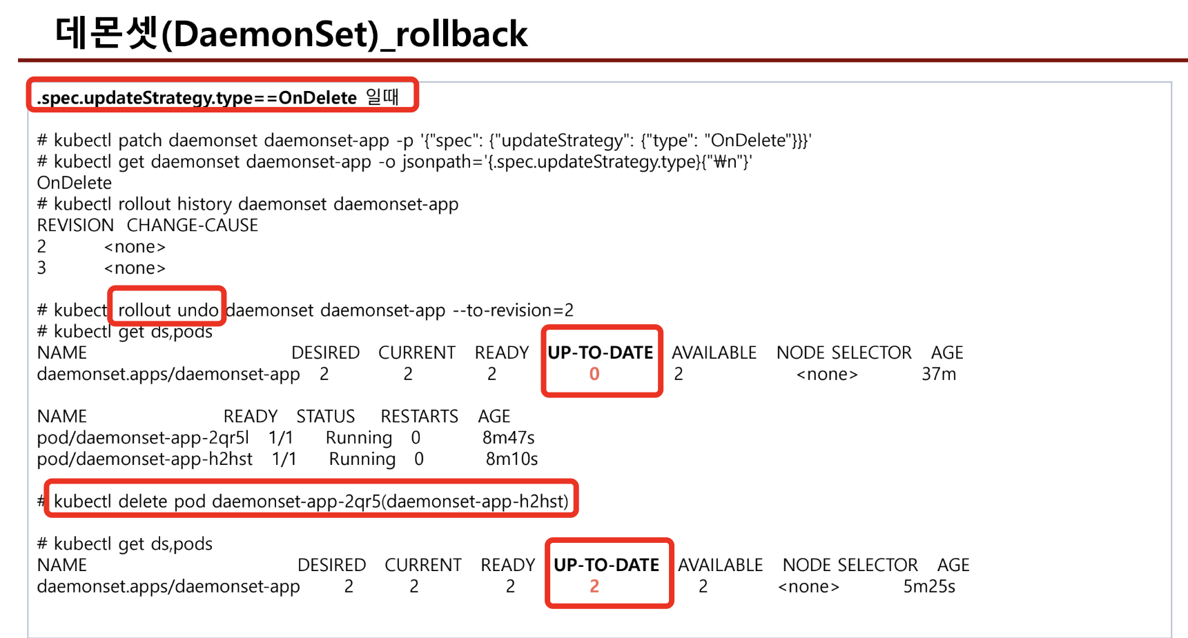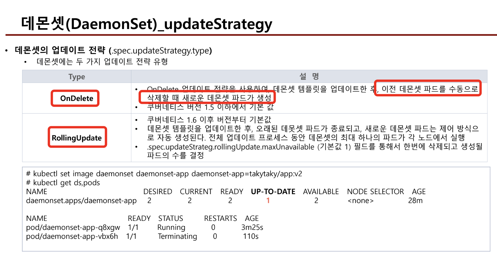 - OnDelete 옵션으로 업데이트 하는 경우, 데몬셋은 수동으로 기존 파드를 삭제하여야 새롭게 ds가 배포된다.