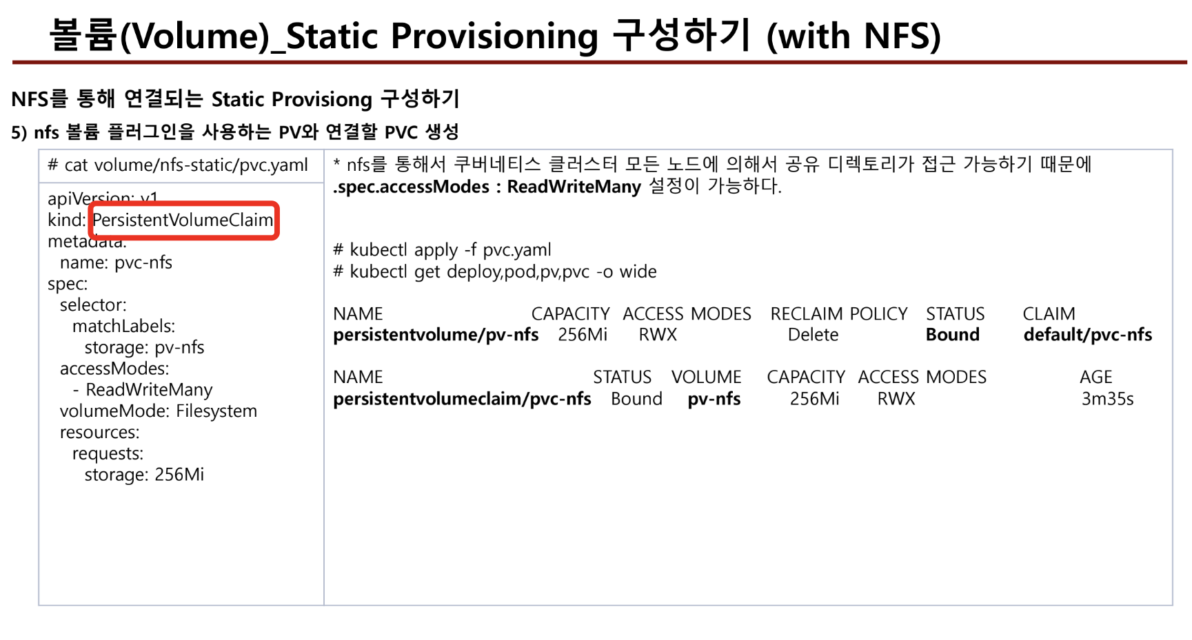 - pv,pvc를 삭제할때 이를 사용중인 pod가 존재하면, Terminating 상태로 변하지만 삭제는 되지 않는다. 실제 삭제하려면 pod -> pvc -> pv 순으로 삭제해 주어야 한다.