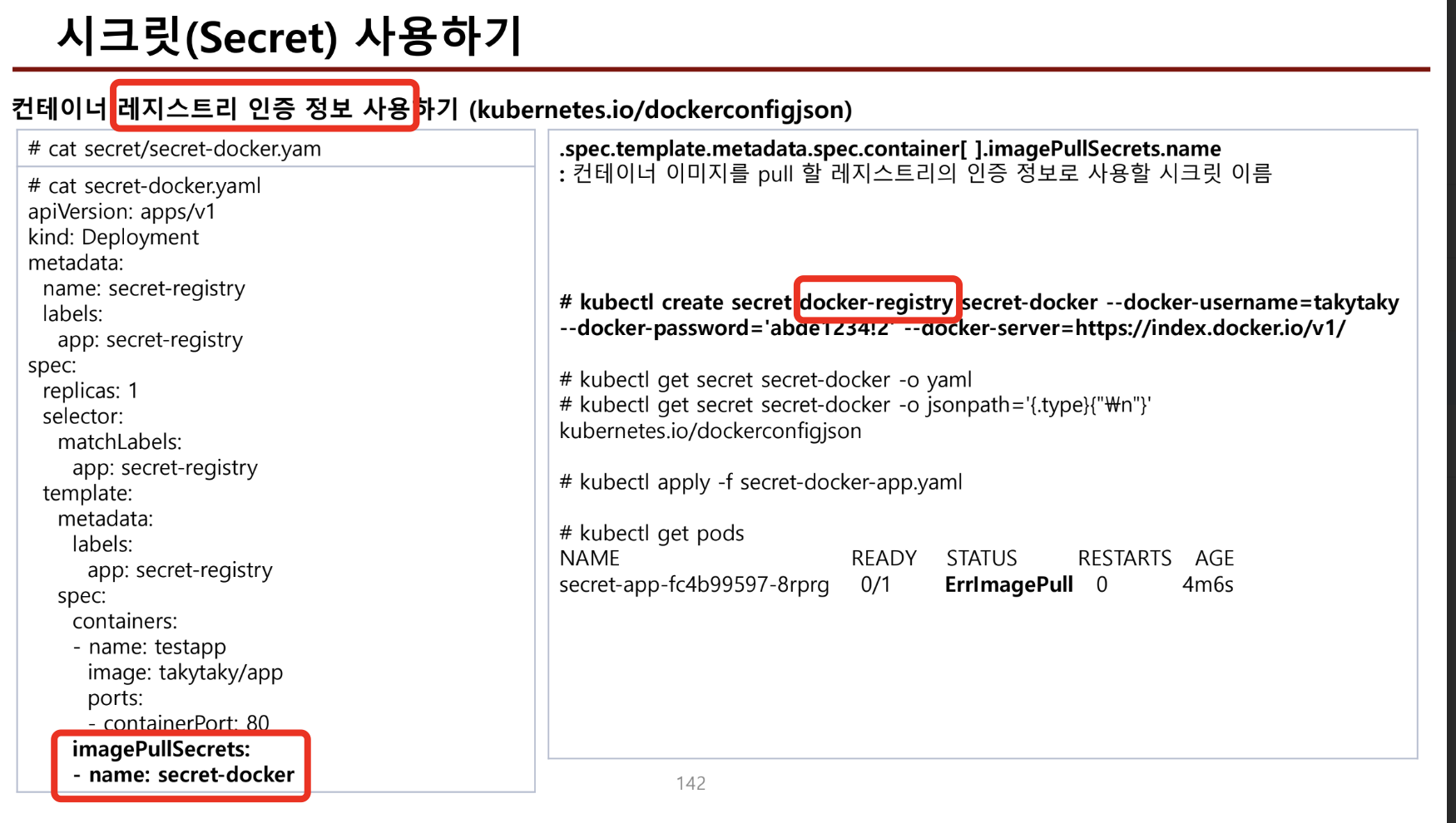 - 도커 이미지를 다운받을때 쓰는 secret을 지정할수 있다 .이때 secret 타입은 docker-registry이다.