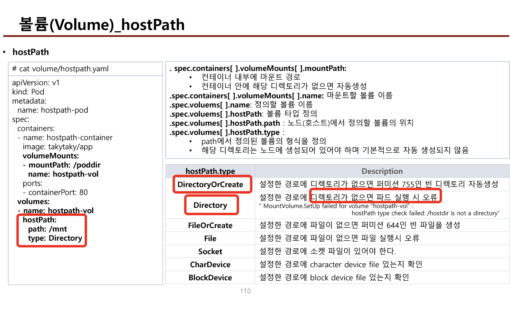 - hostpath type 옵션중 Directory는 연결된 디렉토리가 존재하지 않으면 파드 실행시 에러가 발생한다. 업을때 자동생성을 원하면 DirectoryOrCreate 를 이용하면 된다.