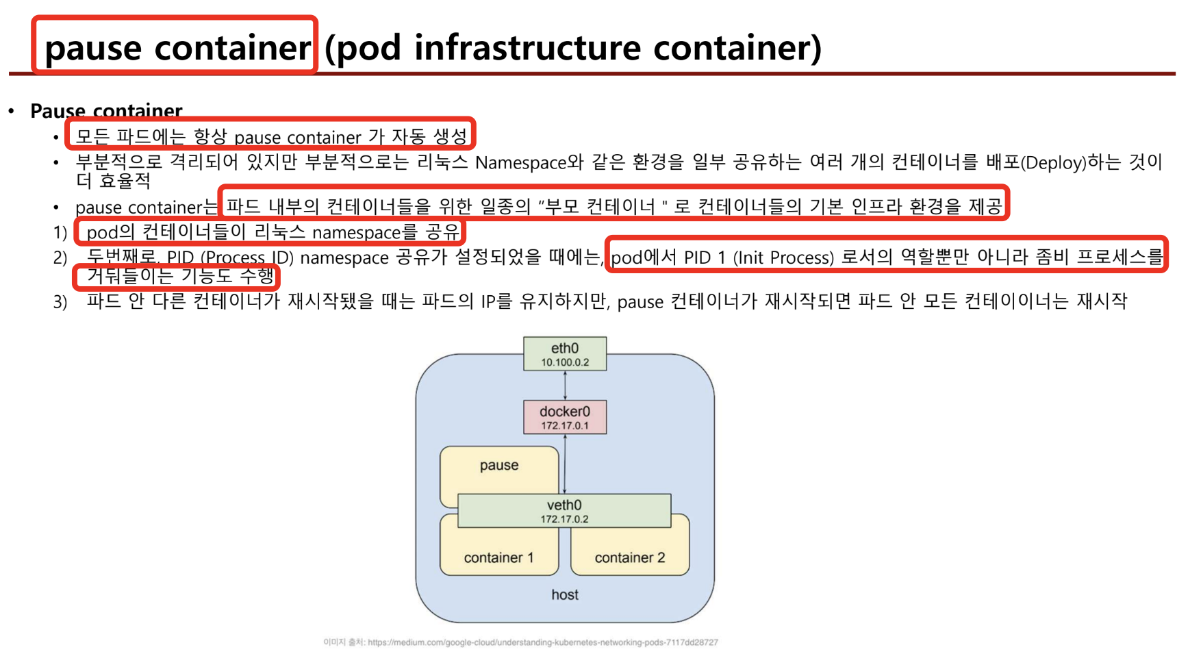 - pause container가 1번 pid 역할을 해주어, 다른 컨테이너가 종료되어도 pod는 그대로 존재한다. 만약 pause container가 죽으면 전체 pod가 새로 생성되어, ip도 변경됨