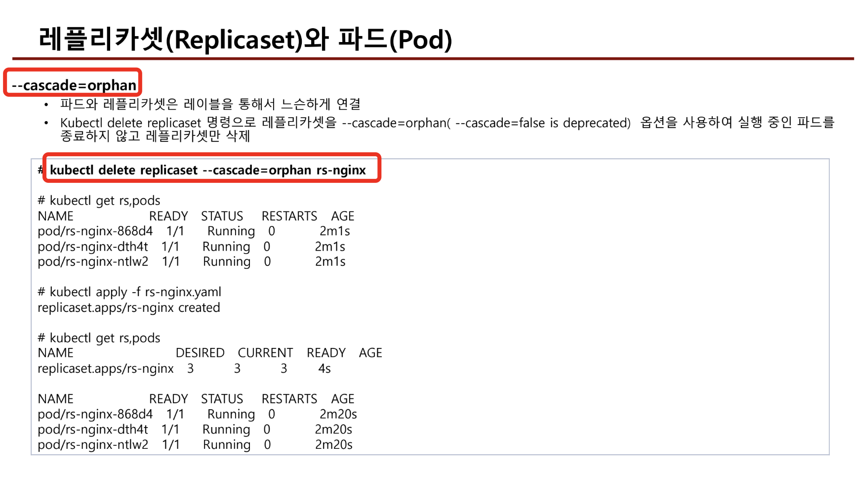 - --cascade=orphan 옵션을 사용하면, pod는 남겨두고 replicaset만 삭제가 가능하다.