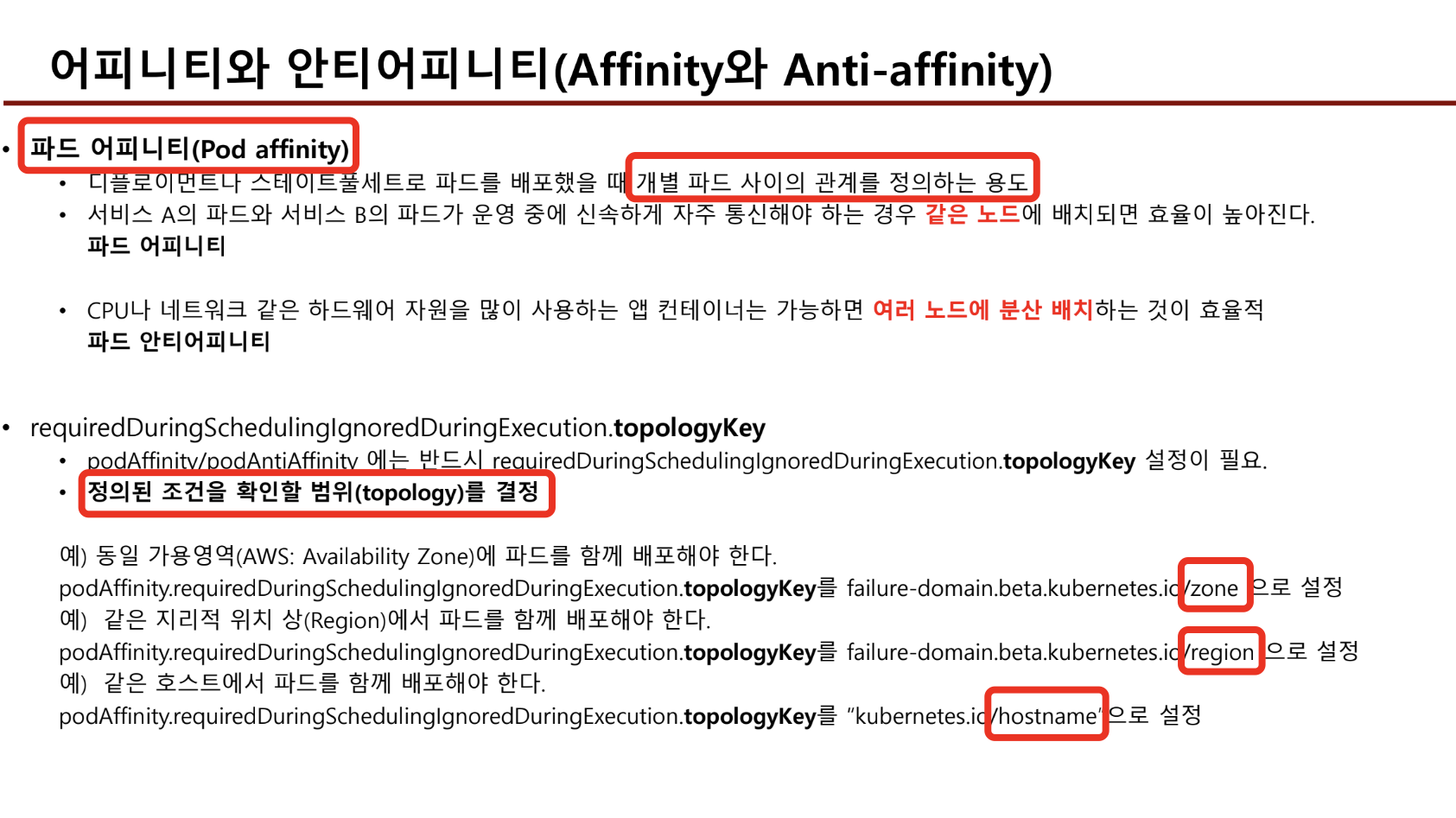 - podaffinity : 파드를 배포했을대 개별파드 사이의 관계를 정의하는 용도