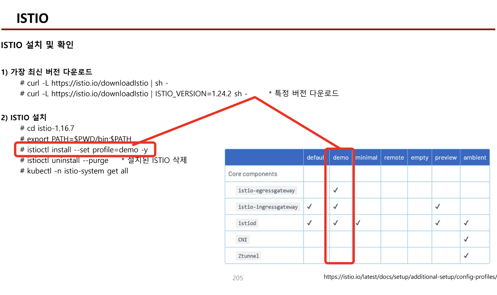 - Istio가 관리하는 것은 app 컨테이너와 연결된 proxy 컨테이너(sidecar container) 들이다.