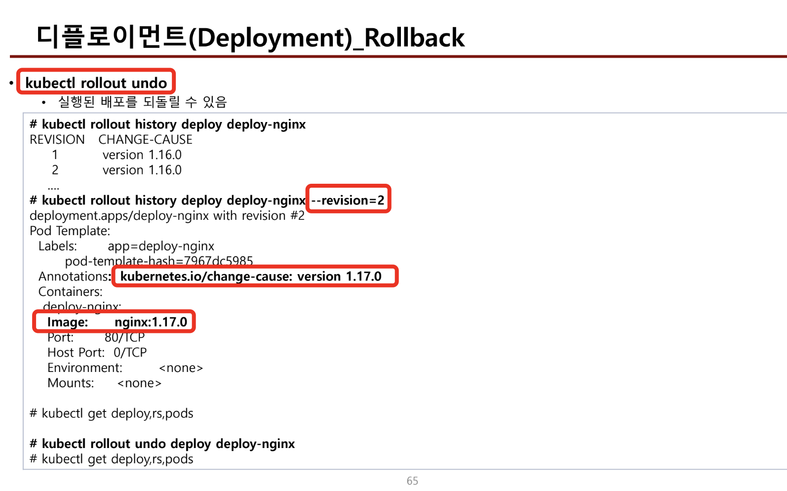 - deployment의 annotation 중 kubernetes.io/change-cause: version 1.16.0
