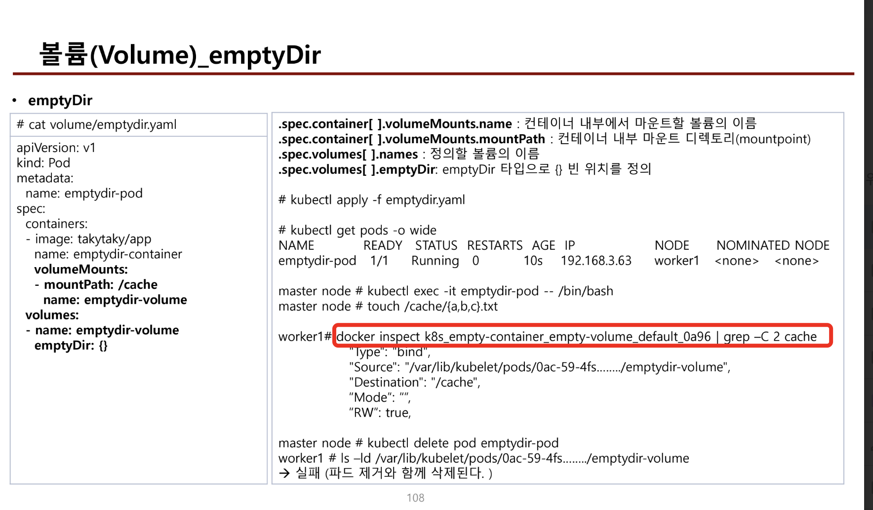 - emptyDir을 연결된 파드를 배포하면 파드가 배포된 노드위치를 확인한다.
