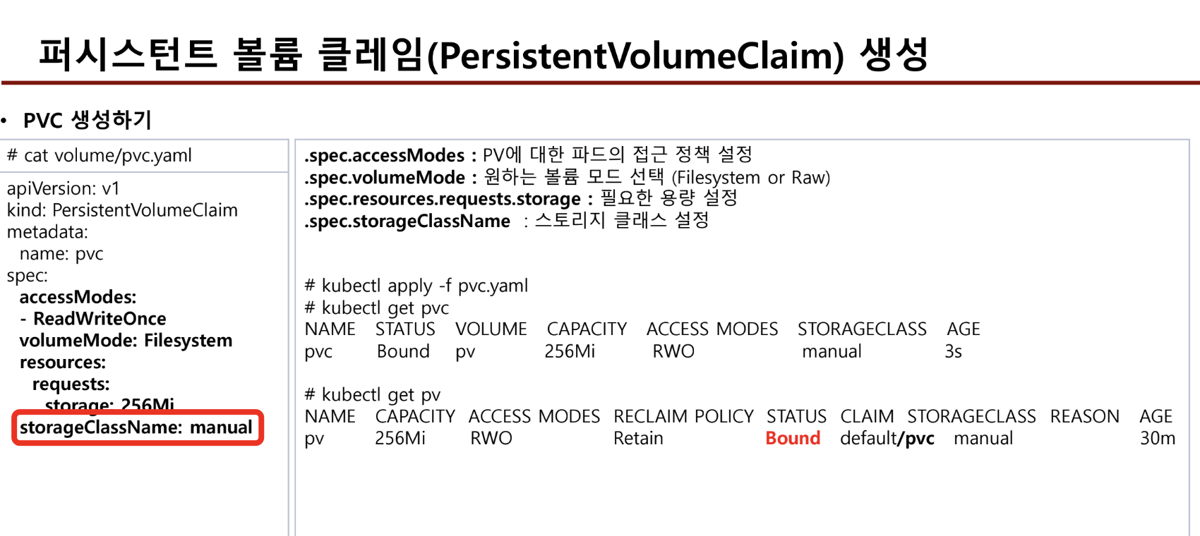 - manual은 sc를 사용하지 않고, 수동으로 pv를 생성하겠다는 의미이다.