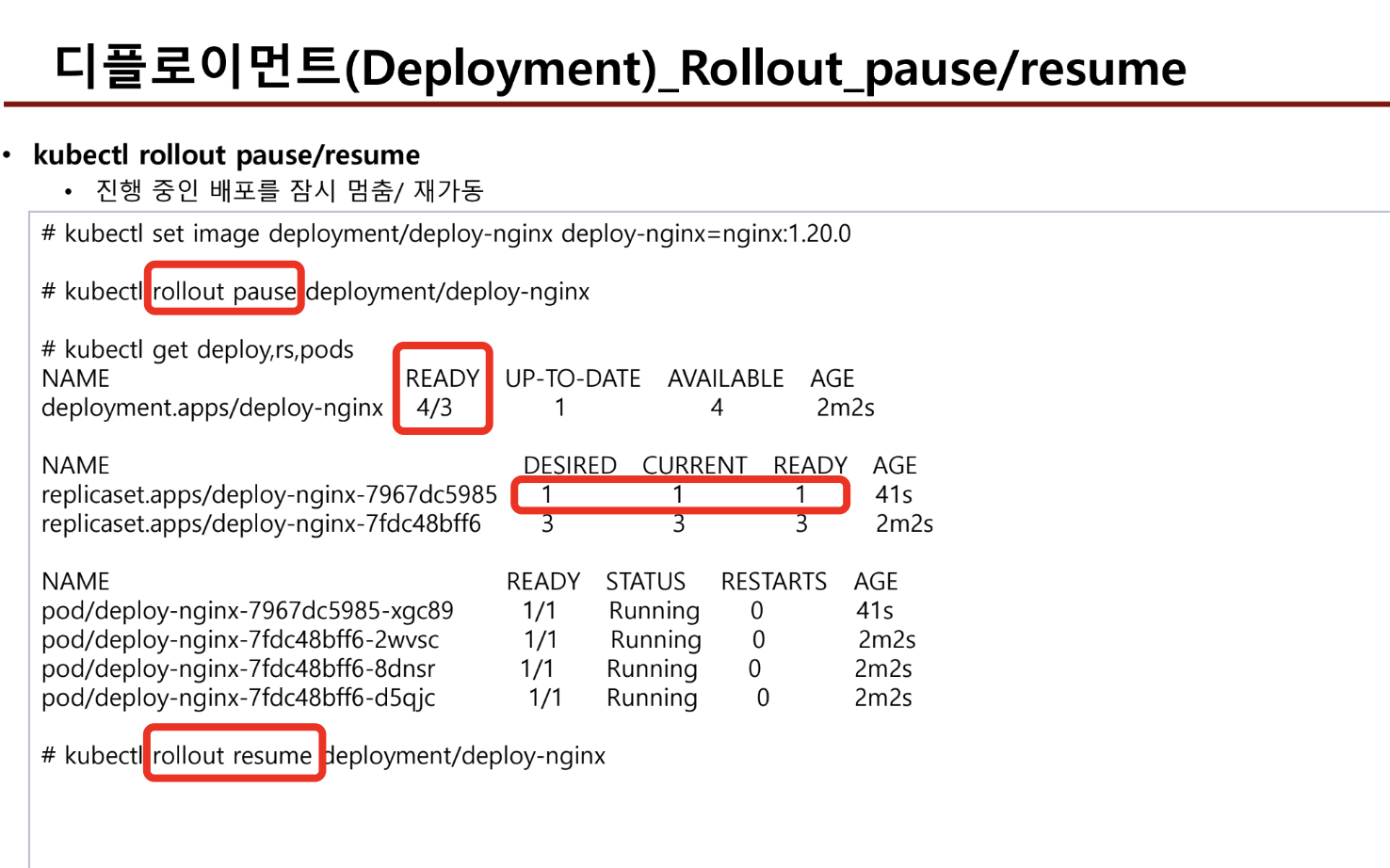 - 이미지 변경으로 rollingupdate가 진행되고 있을때 rollout pause를 사용하면, rollingupdate 진행당시 상황에서 멈춘다.