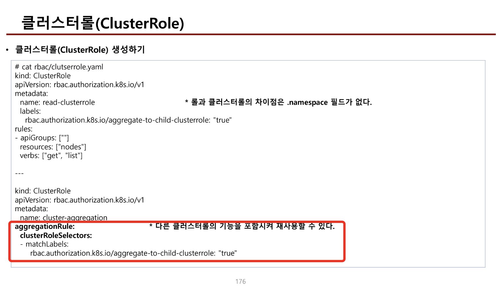 - 롤은 네임스페이스에 종속된 리소스라 aggregationRule로 포함시킬 수 없다.