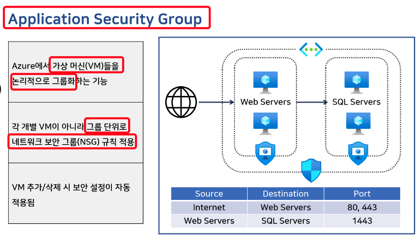 - ASG는 vm묶어서(논리적으로) 한꺼번에 같은 NSG 적용하고 싶을때 사용