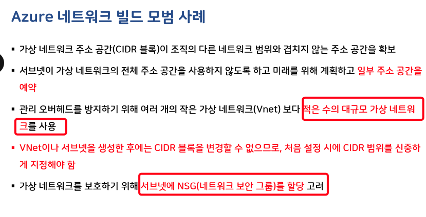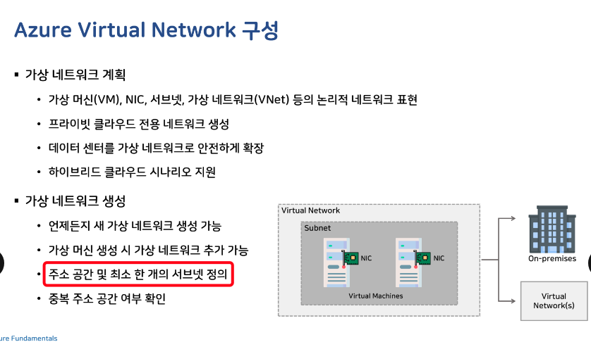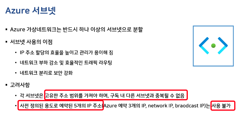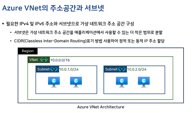- Vnet만 존재하면 VM 못만든다. 최소 하나의 서브넷이 정의되어야 한다.