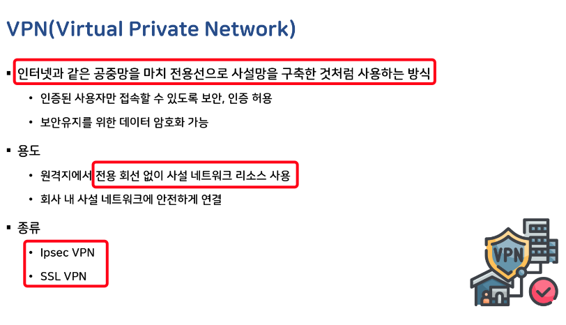 - IPSec VPN : 양 서버간 라우터 장비간에 터널링을 해서 통신 (cloud - on-premise) -> 하이브리드 클라우드 / Aws site-to-site VPN / 본점-지점연결