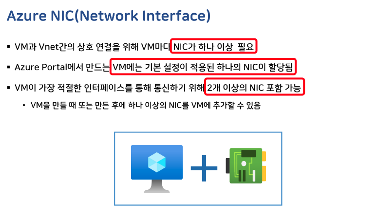- Vnet 과 VM의 상호 연결을 위해 VM마다 최소 하나 이상의 NIC가 필요하다.