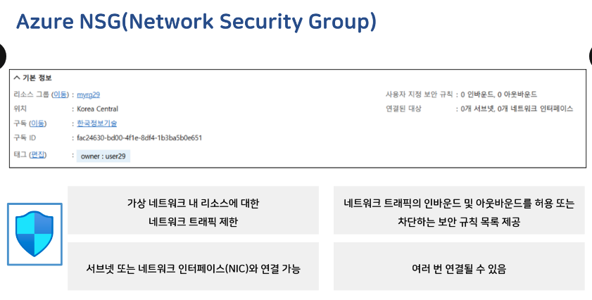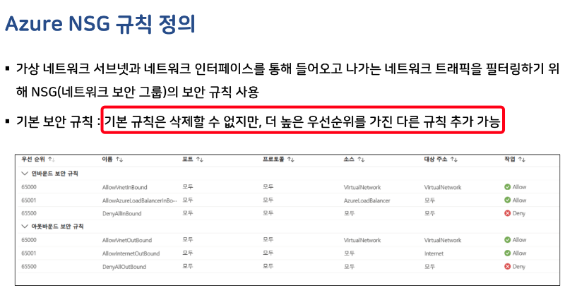 - Aws 가 각각 서브넷, Ec2에 NACL, SG 으로 방화벽 치는것과 달리, Azure는 NSG(Network Security Group)으로 둘다 가능하다.