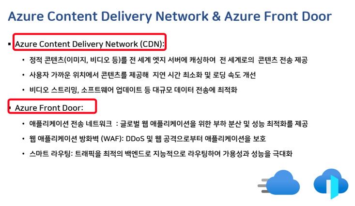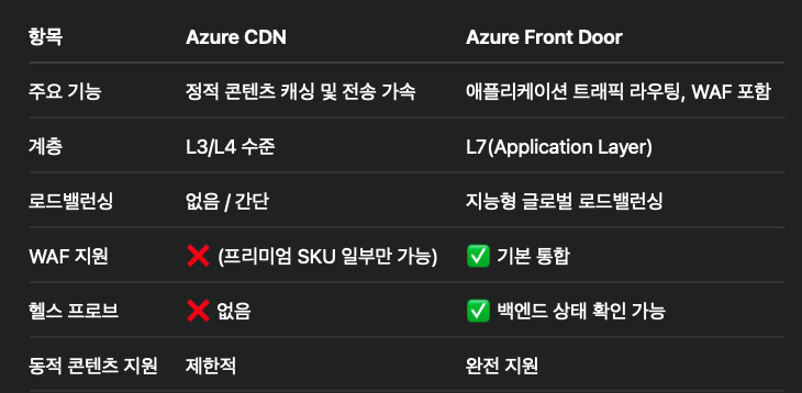 - Azure는 특이하게 CDN 서비스가 두개 존재하는데, CDN 과 Azure Front door 이다. 앞문이라니 직관적이다.. ㅋㅋ