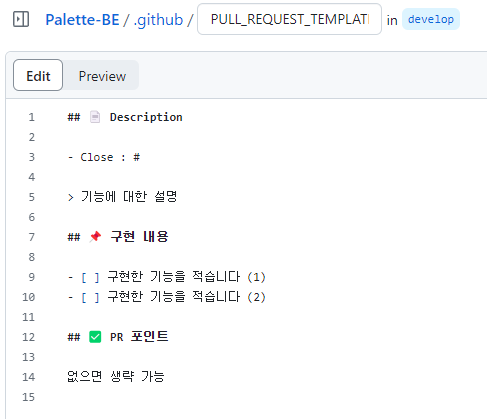 your-repo/.github 폴더 내에 PULL_REQUEST_TEMPLATE.md 생성