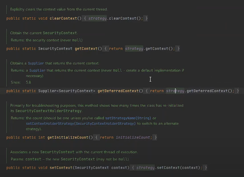 즉, SecurityContextHolder는 SecurityContext들을 관리하는 메소드를 제공하지만, 실제로 등록, 초기화, 읽기와 같은 작업은 SecurityContextHolderStrategy 인터페이스를 활용한다.